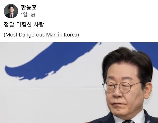 앞서 한 전 대표는 이날 자신의 페이스북에 이재명 대표의 사진과 함께 "정말 위험한 사람(Most Dangerous Man in Korea)"이라고 적었다.