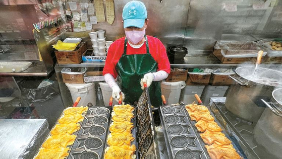 30년째 붕어빵을 판매하고 있는 한국마켓 내 한국치킨에서 직원이 팥앙금 붕어빵을 굽고 있다. 김상진 기자